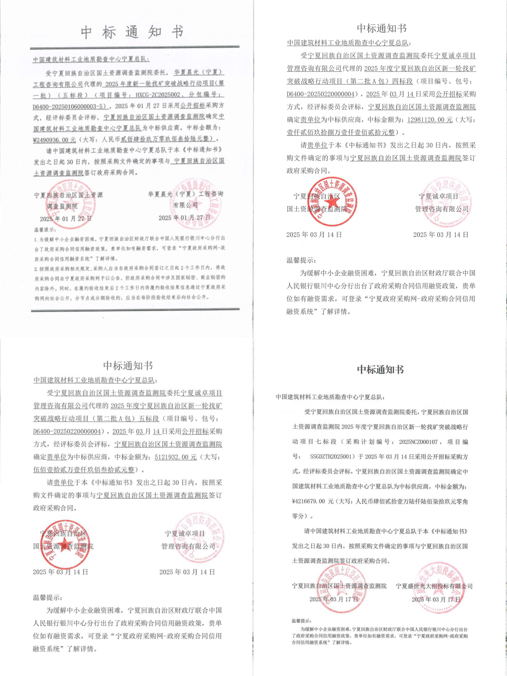 近日,宁夏总队成功竞获2025年度宁夏回族自治区新一轮找矿突破战略行动项目第一批五标段、第二批A包四、五标段及第二批B包七标段,总金额达2481.07万元,单年度获取地勘基金项目总额再创历史新高,业务领域实现多点突破。