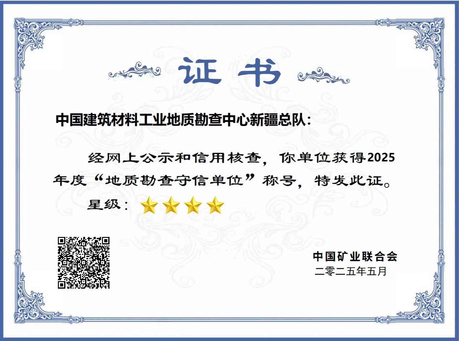 中国矿业联合会自2019年启动地质勘查守信单位诚信建设,设置“五星”等级,星级实行动态调整。当前“四星”为最高等级,新疆总队作为全国首批获评四星级的单位,标志着其在地质勘查信用建设、行业规范运营等方面走在前列,为行业诚信体系建设树立标杆,也为自身高质量发展筑牢信用根基,新疆总队将继续秉持诚信经营理念,以四星荣誉为动力,不断提升勘查技术水平与综合实力,持续发挥示范引领作用,为地质勘查行业高质量发展贡献力量。