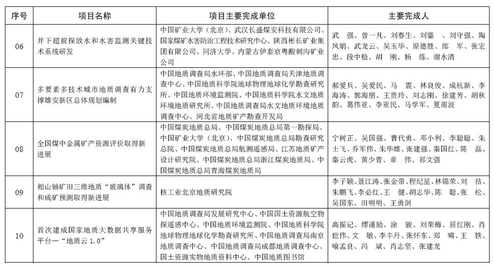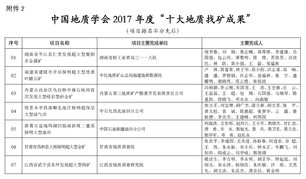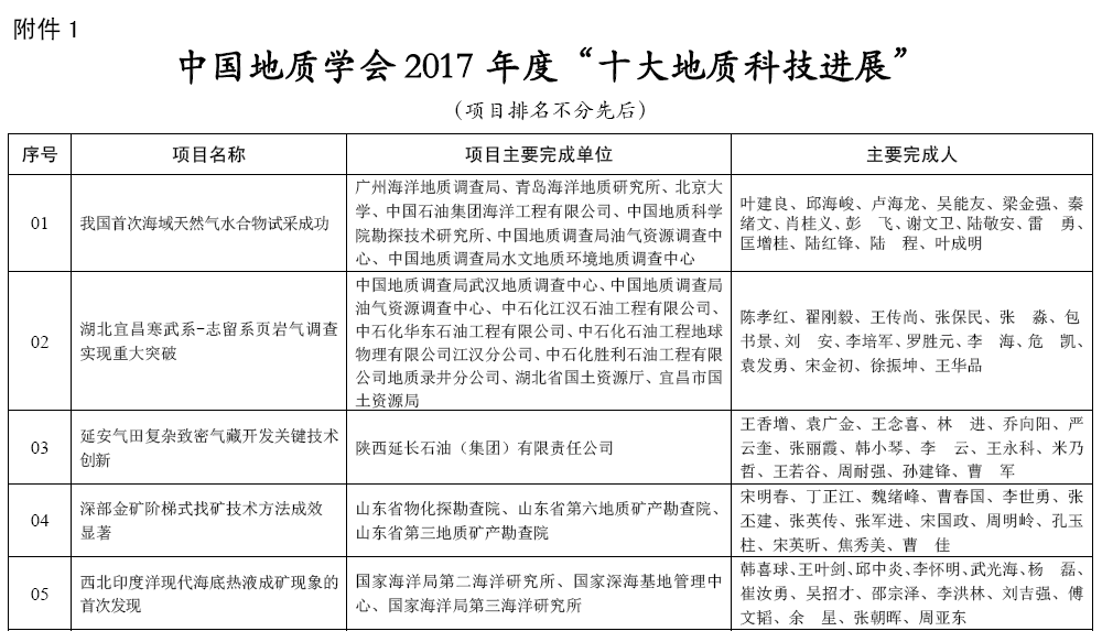 2月9日,中国地质学会公布了2017年度十大地质科技进展和十大地质找矿成果。十大地质科技进展包括我国首次海域天然气水合物试采成功、湖北宜昌寒武系——志留系页岩气调查实现重大突破、首次建成国家地质大数据共享服务平台——“地质云1.0”等。十大地质找矿成果包括湖南省平江县仁里发现超大型铌钽多金属矿、福建省建瓯市井后探明超大型优质叶蜡石矿、内蒙古自治区乌拉特中旗石哈河首次发现大型砾岩型砂金矿等。