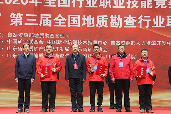 经人力资源和社会保障部批准,由自然资源部地质勘查管理司指导,中国矿业联合会、中国就业培训技术指导中心、自然资源部人力资源开发中心共同主办,山东省地质矿产勘查开发局、山东省矿业协会承办的2020年全国行业职业技能竞赛“山东地矿杯”第三届全国地质勘查行业职业技能竞赛决赛11月18日上午在山东济南落下帷幕。自然资源部人力资源开发中心副主任、竞赛组委会副主任杨学军出席闭幕式并讲话,山东省地质矿产勘查开发局首席专家,本届竞赛常务副裁判长宋明春出席闭幕式并点评。中国地质图书馆党委书记、本届竞赛总裁判长薛迎喜,山东省自然资源厅二级巡视员郑?;?、山东省地质矿产勘查开发局副局长宋学庆、安徽省地质矿产勘查局党委书记、局长朱学文,山东省自然资源厅地勘处处长彭方思、山东省矿业协会会长宋印胜、广西矿业协会会长田凤鸣、黑龙江省矿业联合会会长张文友、广东省矿业协会会长刘长林、山东省第四地质矿产勘查院院长范会凤出席闭幕式,中国矿业联合会秘书长王平主持闭幕式。共有来自19个?。ㄗ灾吻⒅毕绞校┖?家中央直属地勘单位参加本届竞赛。73名参赛选手中,年龄最大者53岁,最小者26岁,其中“80后”占比近9成。