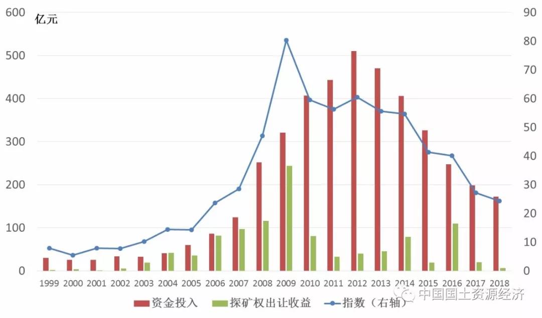 我国地质勘查活动指数回到2006年水平。2016年,虽然探矿权出让收益大幅提升,但我国勘查投入、勘查人员数量等下滑明显,直接导致勘查活动指数下降,比2009年高峰时期下降50%。2017年,我国地质勘查投入下降20%,探矿权出让收益降幅达80%,中国地质勘查活动指数进一步减少。2018年,全国地质勘查投入资金174亿元,同比下降12.4%;探矿权出让收益同比下降70%,钻探工作量同比下降10%,中国地质勘查活动指数回到2006年水平(见图4)。