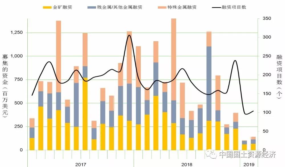 完成融资金额同比减少86%。2019年1—2月,初级和中级勘查公司完成融资额度2.46亿美元,比2018年1—2月融资额减少86%。从不同矿种来看,1月和2月,金矿完成融资105项共1.3亿美元,占比53%;贱金属(铜,镍,铅,锌,银,铂族金属,钼和钴)完成融资57项共0.81亿美元,占比33%;特殊金属(石墨,锂,铌,稀土金属,钽,钛,钨和铀)完成融资41项共0.35亿美元,占比14%(见图3)。