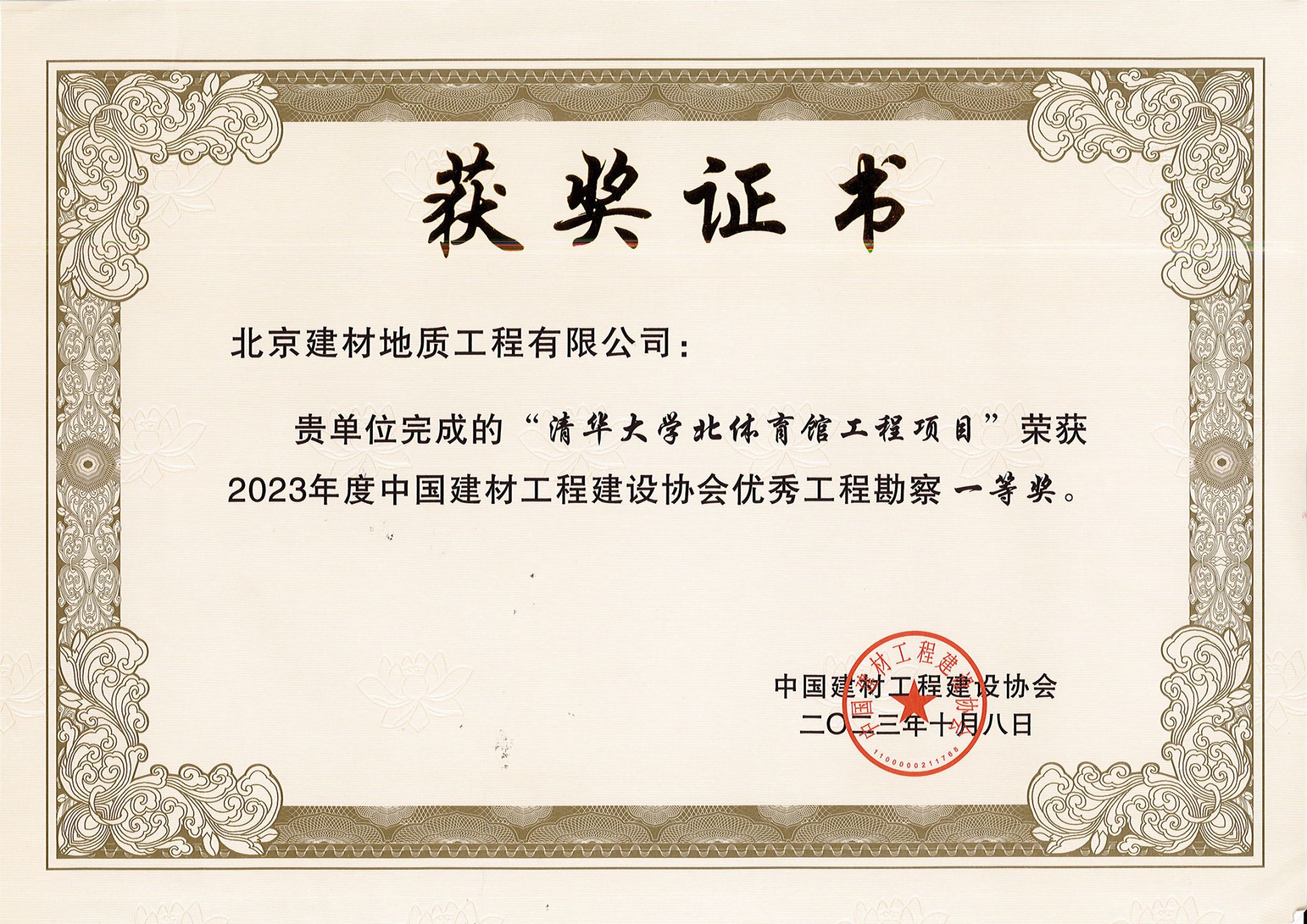 “清华大学北体育馆工程项目”荣获2023年度中国建材工程建设协会优秀工程勘察一等奖。