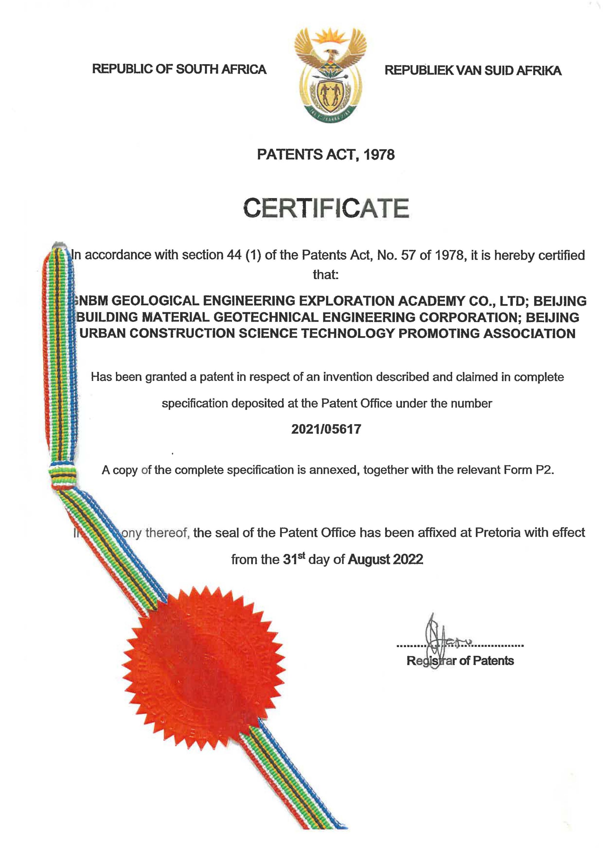 (二)工程公司何世鸣撰写的南非发明专利《无水厚砂卵砾石地层长螺旋钻孔灌注桩施工工艺》荣获地勘中心国际专利奖。