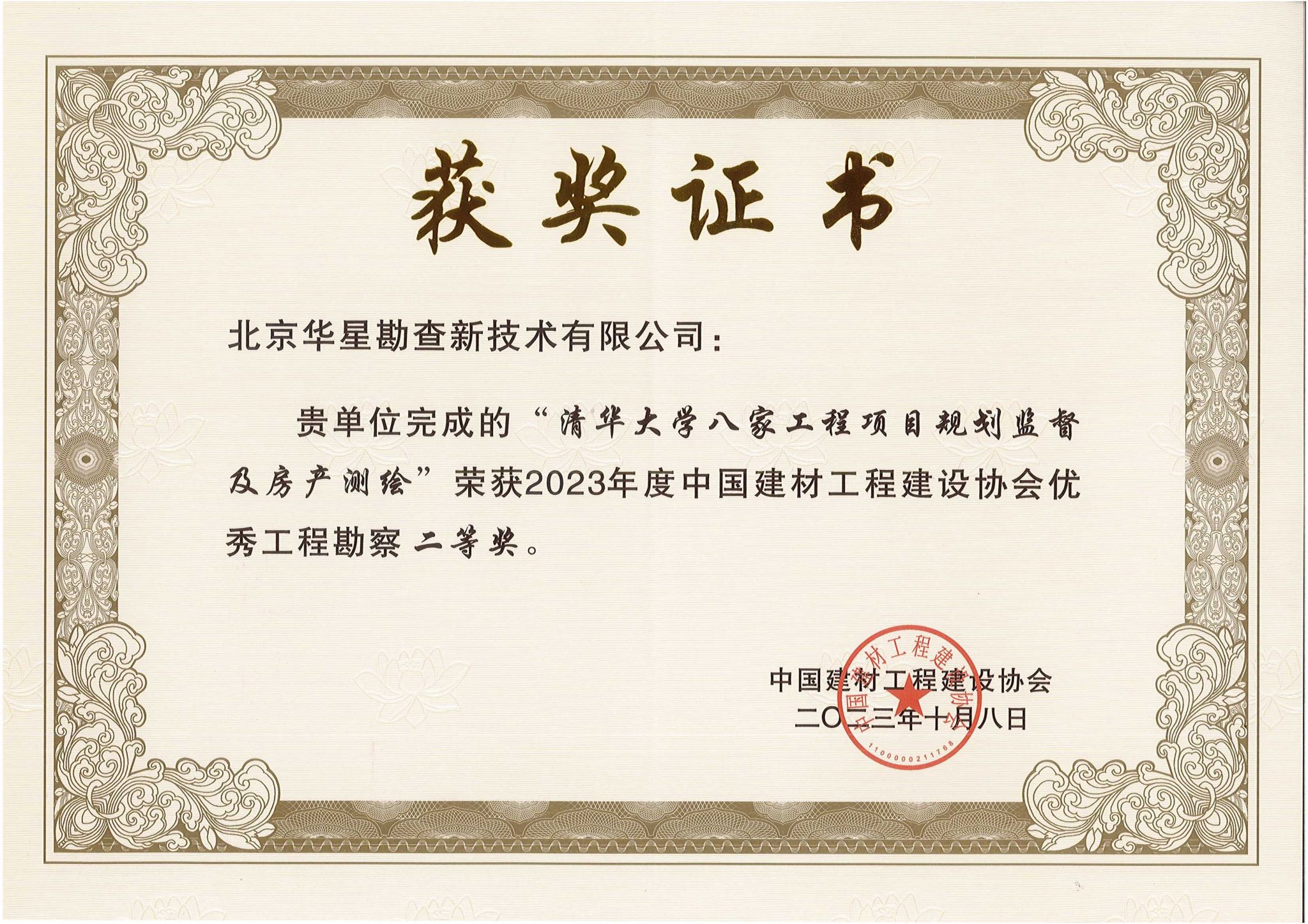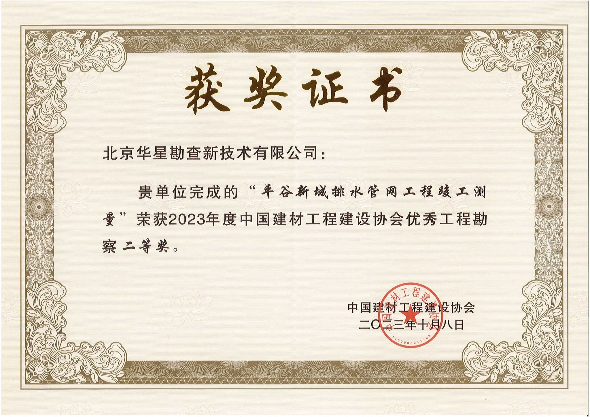 “平谷新城排水管网工程竣工测量” “清华大学八家工程项目规划监督及房产测绘”荣获2023年度中国建材工程建设协会优秀工程勘察二等奖。