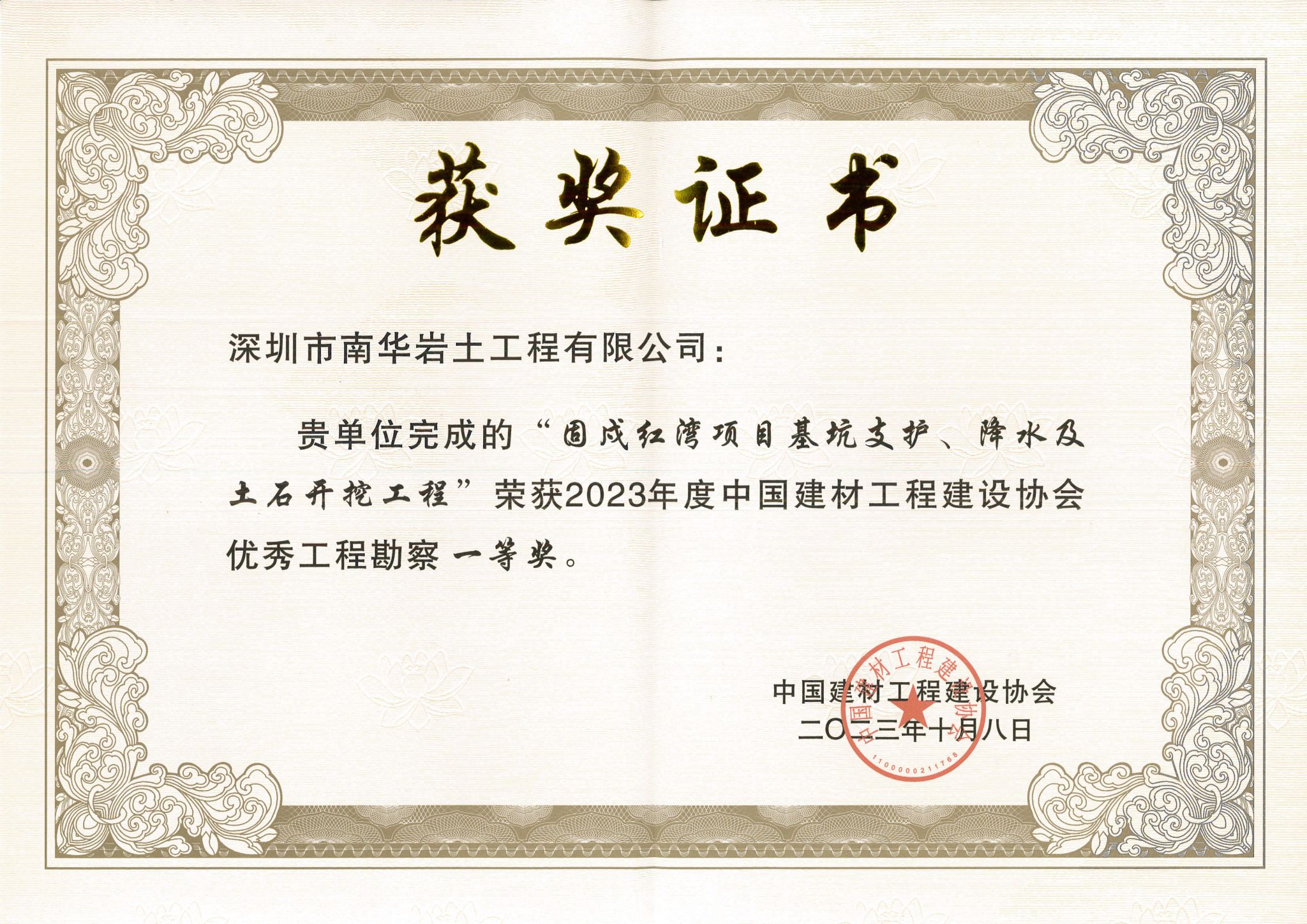 1.“固戍红湾项目基坑支护、降水及土石开挖工程”荣获2023年度中国建材工程建设协会优秀工程勘察一等奖;