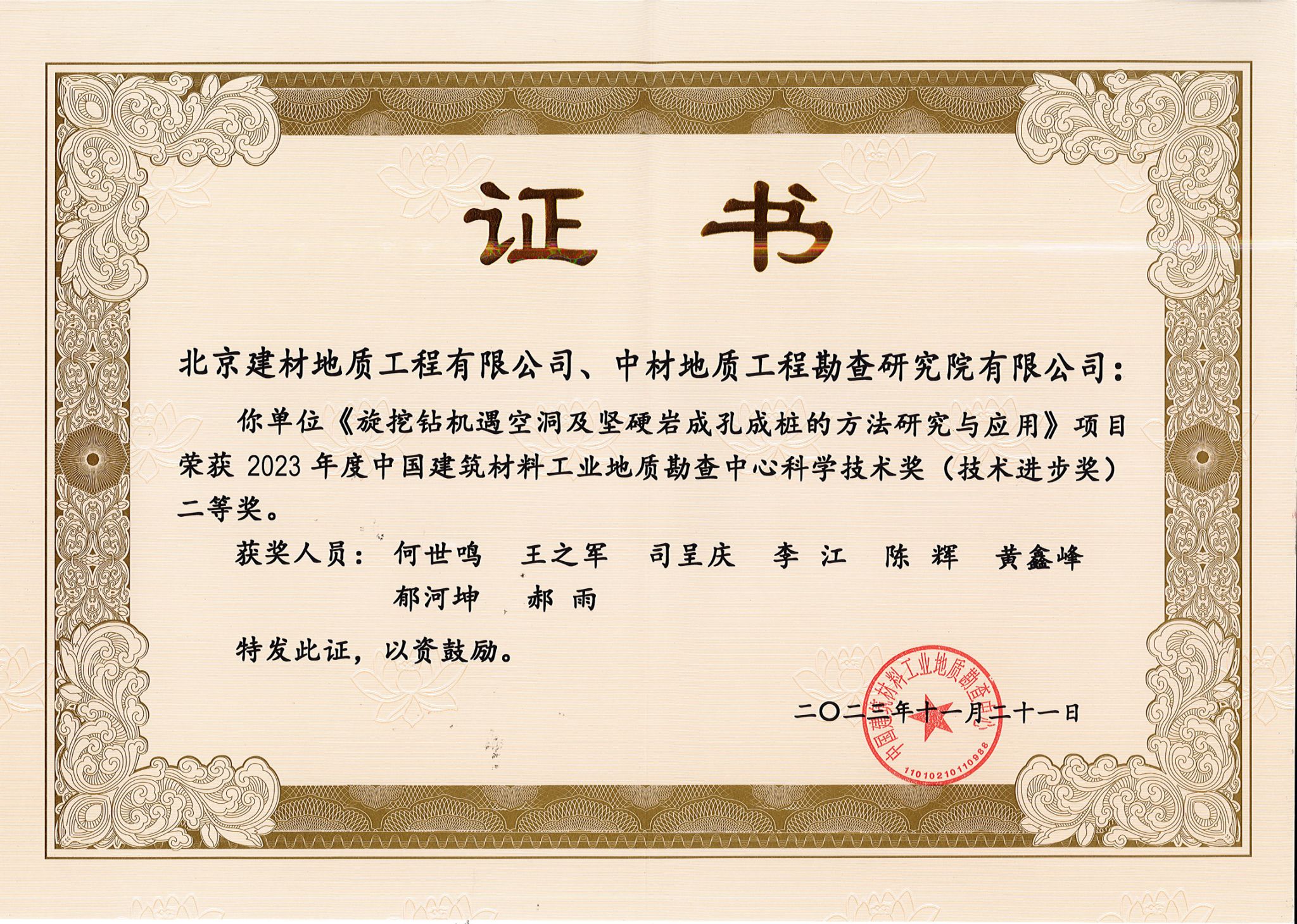 (一)工程公司何世鸣负责的《旋挖钻机遇空洞及坚硬岩成孔成桩的方法研究与应用》项目荣获地勘中心“2023年度科学技术奖(技术进步奖)”二等奖;