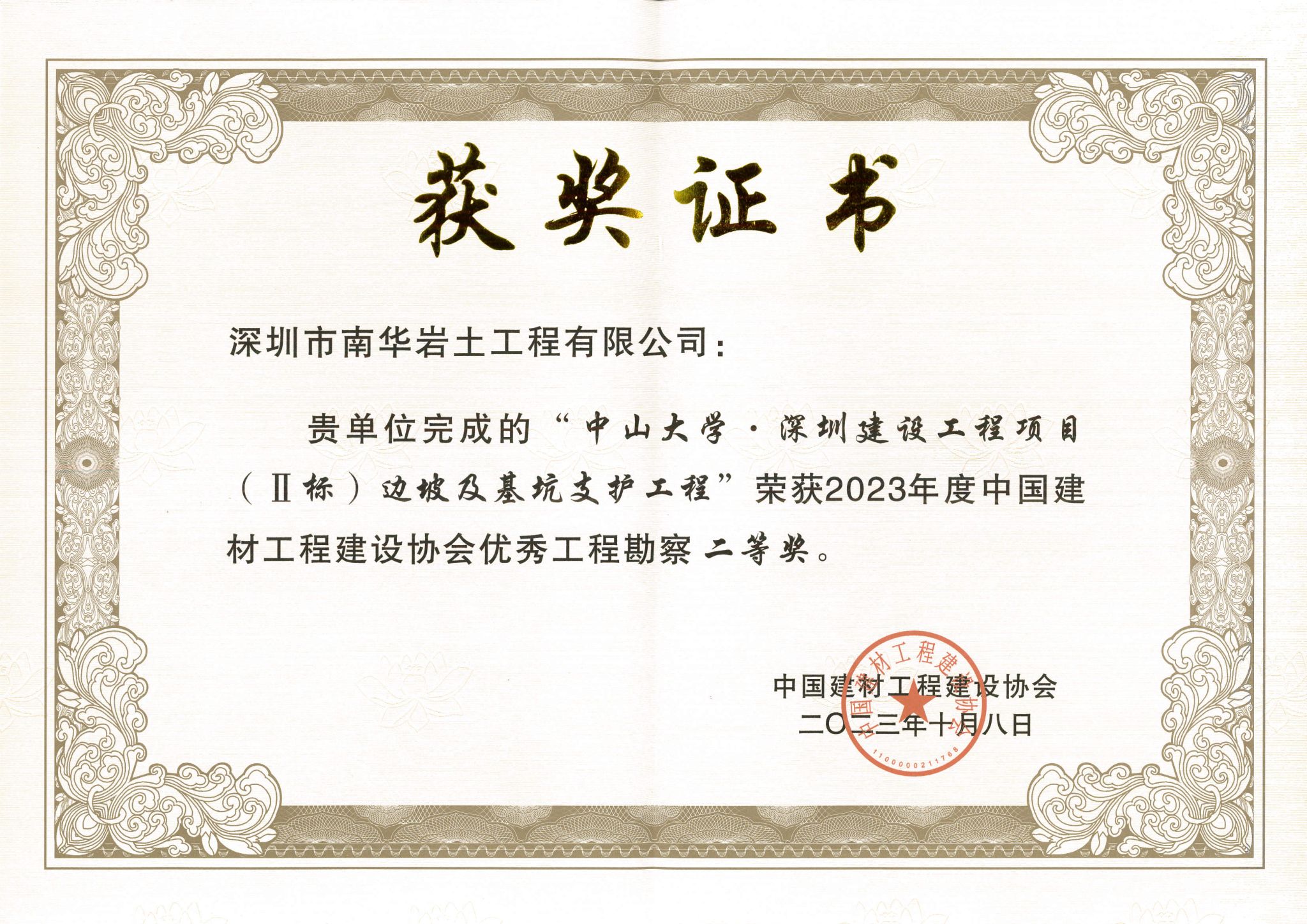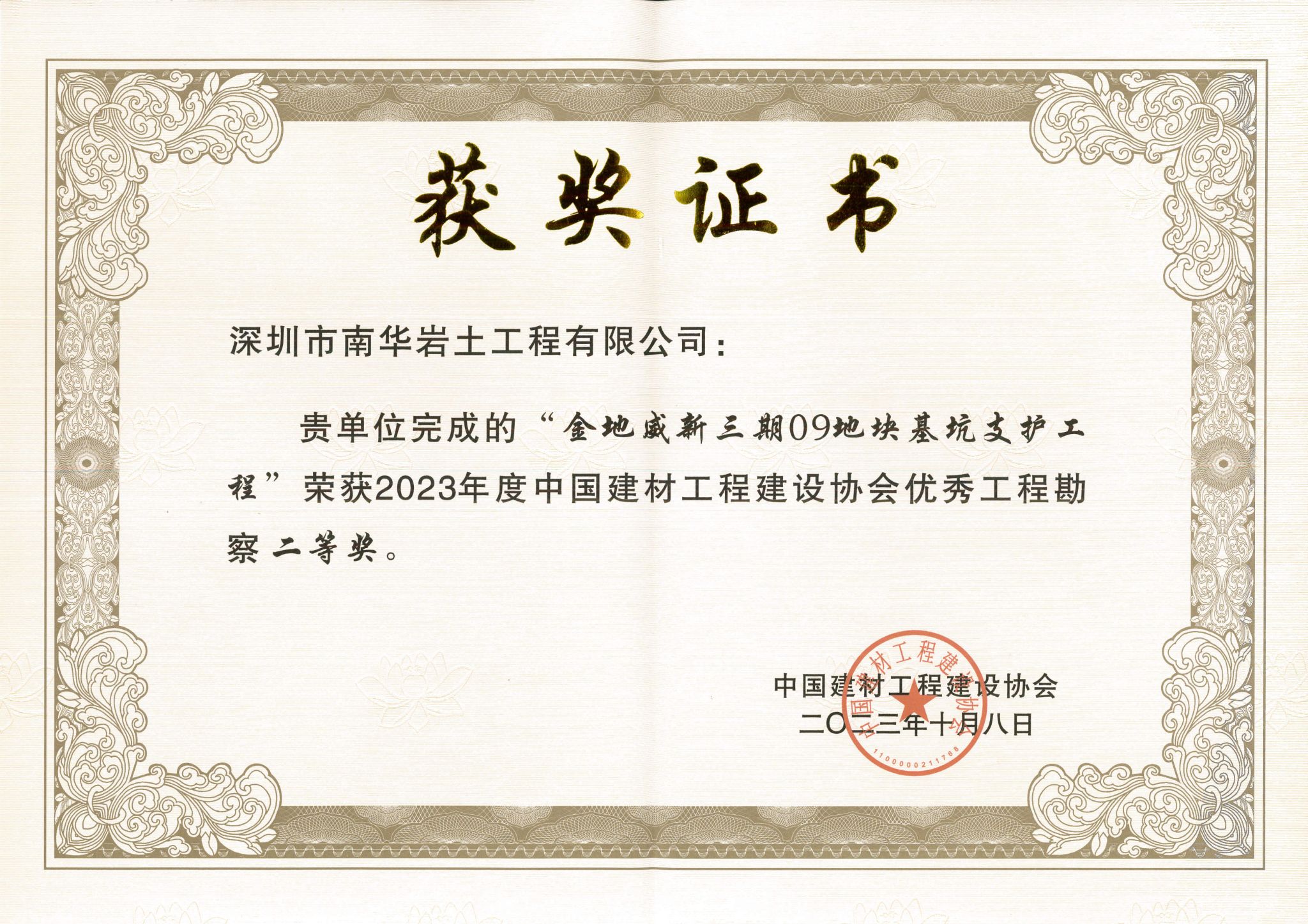 2.“金地威新三期09地块基坑支护工程”、“中山大学·深圳建设工程项目(II标)边坡及基坑支护工程”荣获2023年度中国建材工程建设协会优秀工程勘察二等奖;
