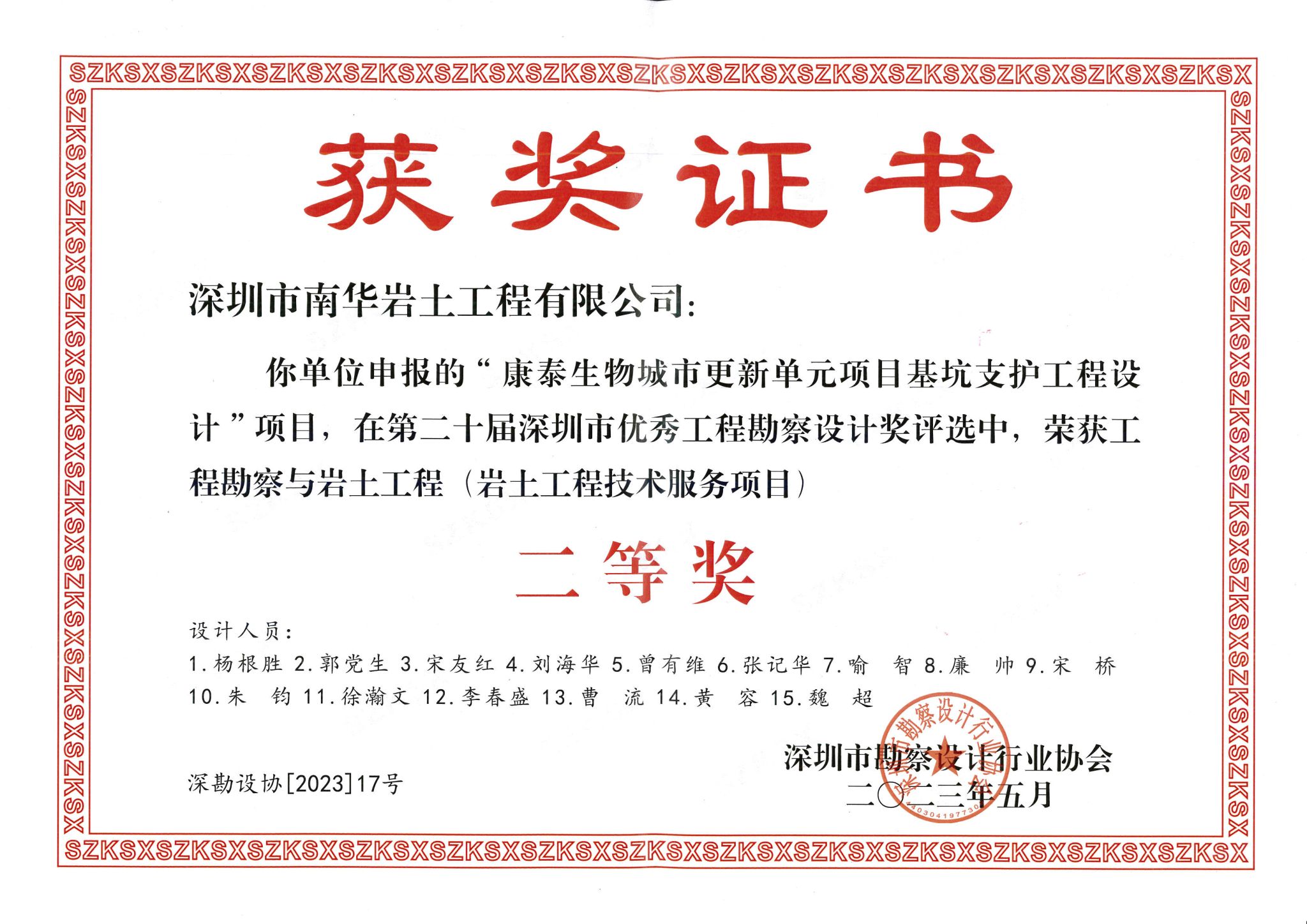 3.“康泰生物城市更新单元项目基坑支护工程设计”荣获深圳市勘察设计行业协会工程勘察与岩土工程(岩土工程技术服务项目)二等奖。