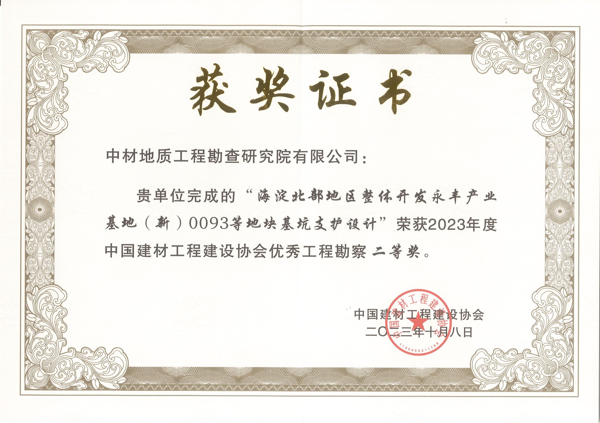 2.“海淀北部地区整体开发永丰产业基地(新)0093等地块基坑支护设计”荣获2023年度中国建材工程建设协会优秀工程勘察二等奖。