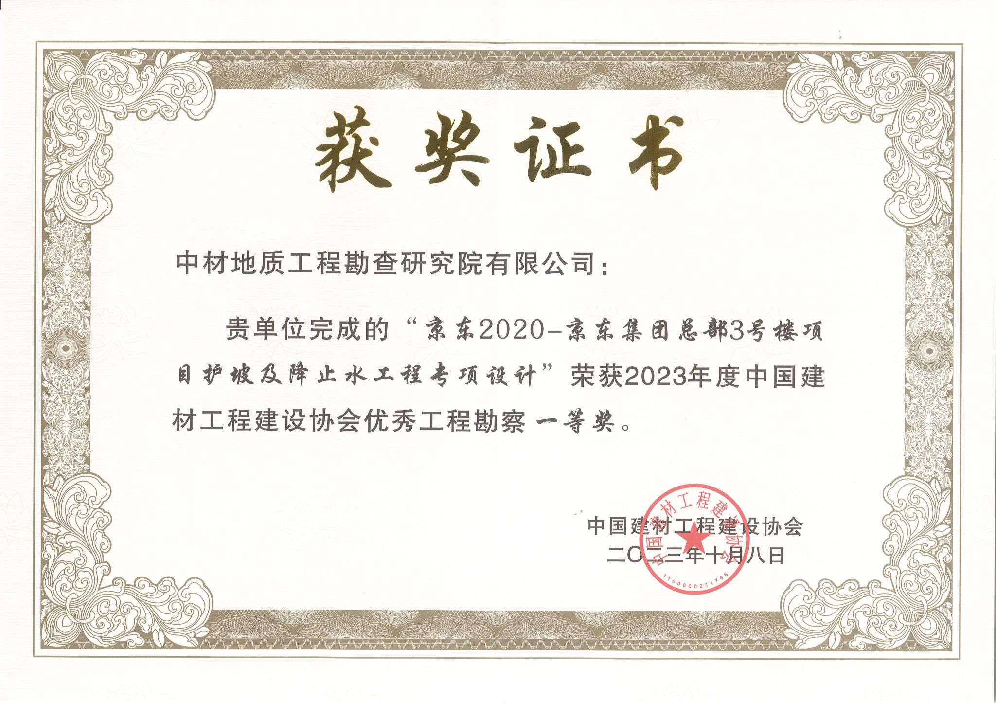 1.“京东2020-京东集团总部3号楼项目护坡及降止水工程专项设计”荣获2023年度中国建材工程建设协会优秀工程勘察一等奖;
