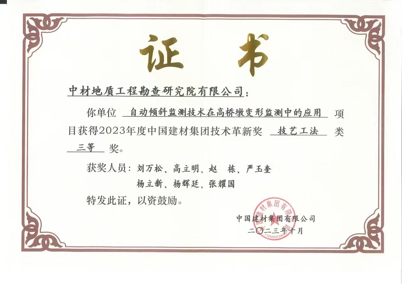 工程勘察院刘万松负责的《自动倾斜监测技术在高桥墩变形监测中的应用》项目荣获中国建材集团“2023年度技术革新(技艺工法类)三等奖。