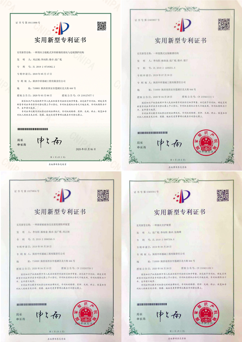 近年来,陕西总队技术创新取得丰硕成果,仅2020年上半年,就已成功申请了“一种预应力装配式异形桩墙的基坑与边坡围护结构”、“一种基坑支护装置”、“一种便携式安装横撑结构”、“一种挤密桩桩体压实度检测取样装置”4项国家实用新型专利。
