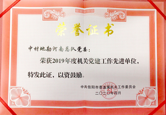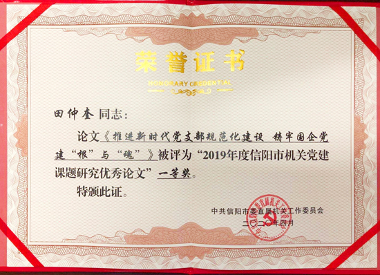 近日,在中共信阳市委直属机关工委召开的“全市机关党的建设工作会议”上,河南总队党委被评为“2019年度机关党建工作先进单位”,田仲奎撰写的论文《推进新时代党支部规范化建设 筑牢国企党建“根”与“魂”》荣获2019年度“市直机关党建课题研究优秀论文”一等奖。