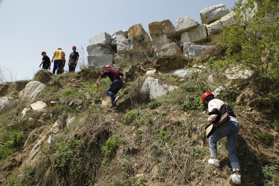 随后,大家前往泌阳中联2000万吨建筑骨料生产线隧道钻孔项目部,沿着崎岖的山路徒步近一小时来到钻探施工现场,现场观摩钻机取岩芯过程和参观一线员工的作业环境、生活环境,听项目经理介绍、与工作人员深入交流了解项目及施工进展情况,切身感受到野外工作的艰辛和生产一线员工的辛勤付出,更深刻地领悟到地勘人“三光荣四特别”的精神内涵,大家深受感染,更多了一份对地质工作和地质人的理解与尊重。