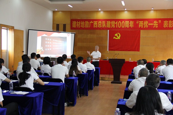 表彰大会在激昂的国歌声中拉开序幕。大会传达了地勘中心“两优一先”表彰大会的精神,对获得总队“先进基层党组织”称号的地质党支部、获得总队“优秀党务工作者”称号的何永坤同志和获得总队“优秀共产党员”称号的13名党员进行了表彰。