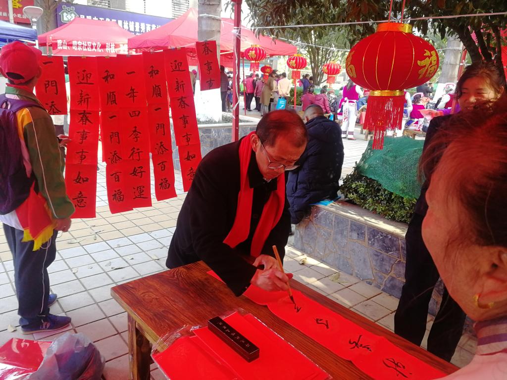 在民俗闹新春活动中,温智贤同志与其他党员志愿者一起,向前来参加活动的数百居民,展示了手工糖画、捏面人和送窗花等传统民俗活动,并现场泼墨,为广大居民撰写春联近百幅。极大的丰富了眠山社区居民的节日文化生活,受到上级主管领导和辖区居民的一致好评。