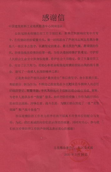 3月31日,河南总队收到信阳市浉河区五里墩办事处八一社区党支部送来的一份特殊“礼物”—— 一封疫情防控感谢信,感谢河南总队党员芦俊同志在新冠肺炎疫情防控关键阶段挺身而出、坚守一线,参与协助社区的疫情防控工作。