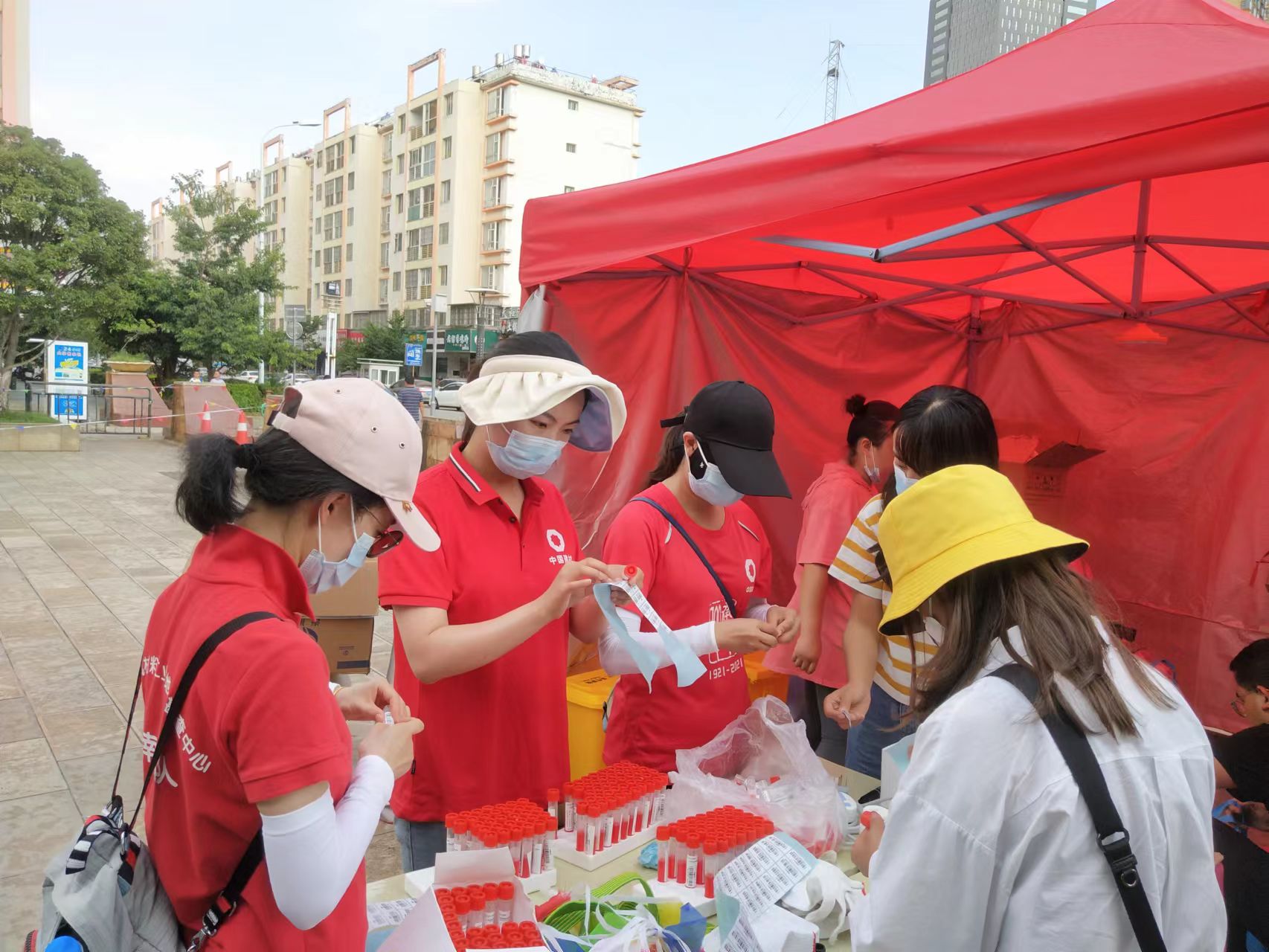 在社区工作人员的带领下,志愿者们对美丽新世界核酸检测点片区的街道及周边绿化带进行了垃圾清理工作,将乱停乱放的共享车辆停放在规定的位置,并为第二天的核酸检测进行检测点布场。搬运物资、拉设排队围挡、设置一米线、为试剂粘贴二维码......真正做到了“在防疫面前,没有局外人”。