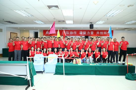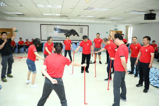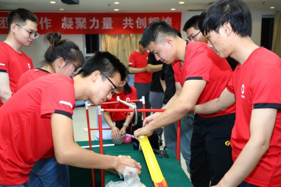 拓展活动开始之前,教练通过一系列幽默有趣的“破冰”活动,让大家打破了部门、职务、年龄的界限,真正融合在一起。在教练的指导下,全体人员分成四个小组,各组成员集思广益、各显神通,为自己小组取了响亮的名字和口号,并在组建团队的过程中拉近了彼此的距离。团队成功组建后,在教练的培训指导下,陆续开展了“挑战戈德堡”、“世界之球”、“挑战生死99秒”等拓展项目。