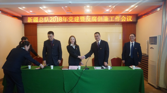 党委书记高红彦与总队领导班子成员、党支部书记签订《新疆总队2018年党风建设及廉政从业责任书》。