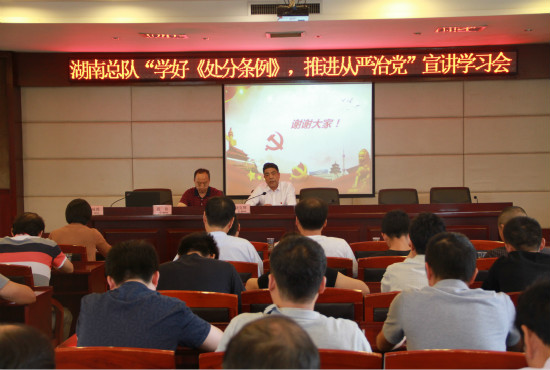 2018年9月28日下午,湖南总队开展全体党员、积极分子、中层及以上领导干部党课学习活动,组织学习新修订的《中国共产党纪律处分条例》,进一步加强纪律约束和规矩意识,确保廉洁过国庆。总队党委书记段伟同志主持,总队党委副书记、纪委书记龙咏霞同志传达学习。