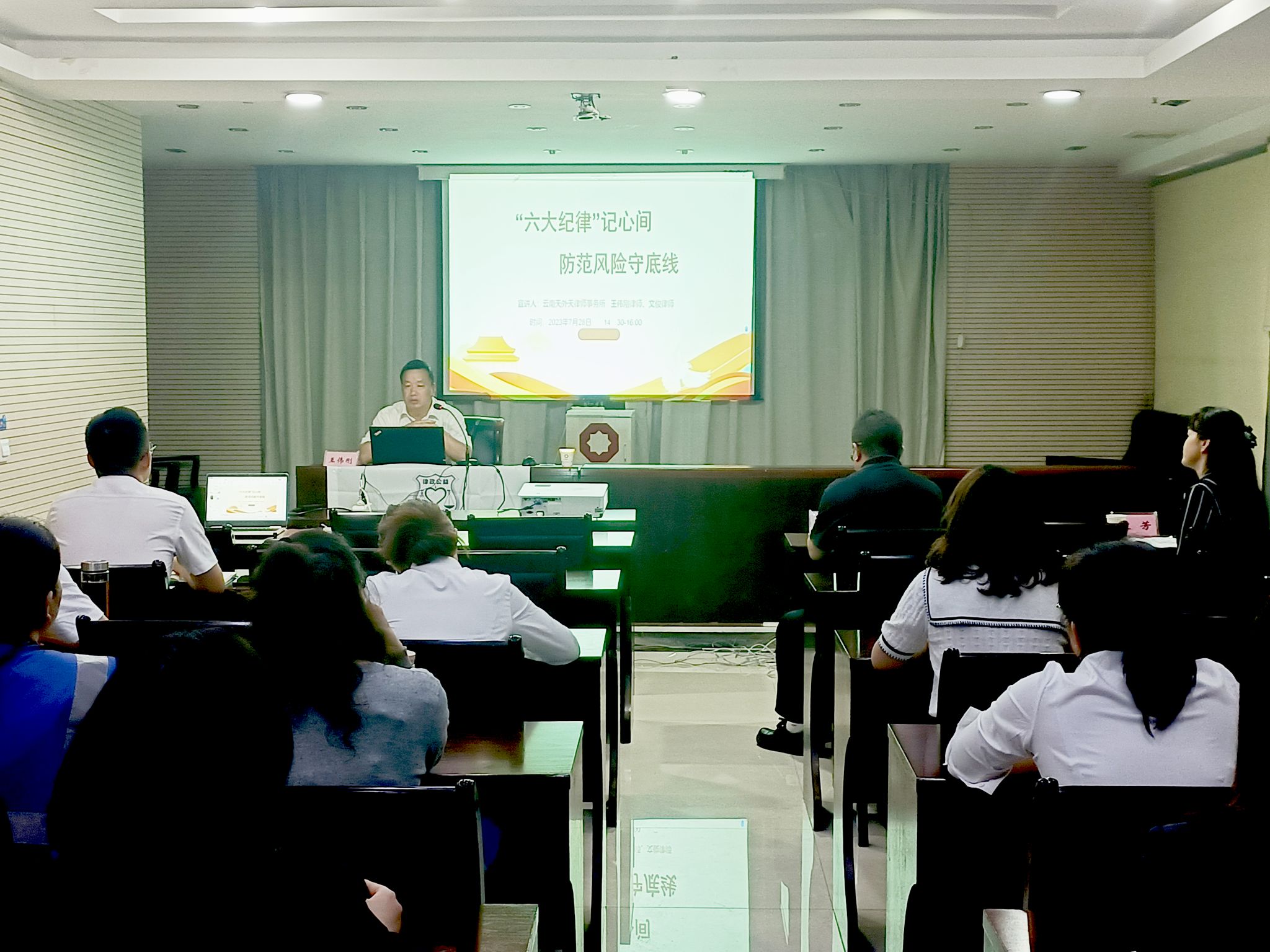 为深入开展普法宣传教育,促进云南总队全体干部职工学法、守法、懂法,不断提升法律风险防控意识。2023年7月28日,云南总队邀请云南师范大学毒品犯罪研究中心主任、云南天外天律师事务所高级合伙人王伟刚律师到队讲授《“六大纪律”记心间、防范风险守底线》专题法律讲座。