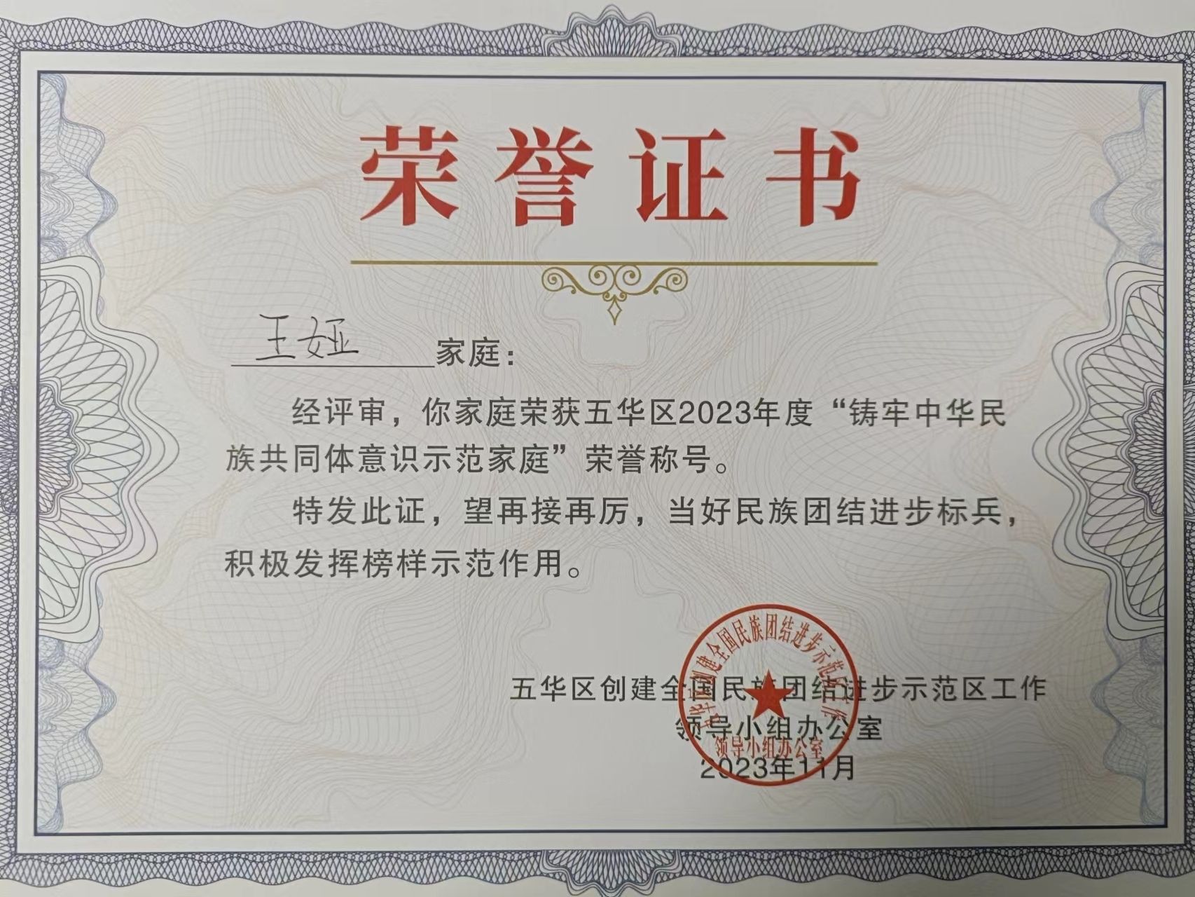 为进一步做深做实做细新时代党的民族工作,有形有效有感开展铸牢中华民族共同体意识工作,云南总队深入挖掘身边职工团结进步的感人故事,经驻地社区推送,王娅等5个员工家庭被评选为五华区2023年度“铸牢中华民族共同体意识示范家庭”。11月30日,丰宁社区为辖区内获得该荣誉的家庭颁发了证书,鼓励表彰示范家庭带给社区的积极影响。