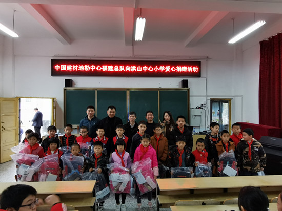 陈海岩代表福建总队在捐赠仪式上发表讲话。讲话指出,龙岩市永定区是总队多年来地质项目的集中区域,丰富的地质矿产资源为福建省水泥、建筑等基础性行业发展提供了坚实保障。总队与永定区人民共同为省内经济发展付出了长期努力,在项目开展过程中结下了深厚情谊。为乡村校园基础教育事业略尽绵薄之力是总队义不容辞的公益责任,也是作为国有企业积极承担社会责任的应有之义。希望洪山中心小学的孩子们努力学习、健康成长,为建设更加美好、富饶的新家乡积蓄力量。