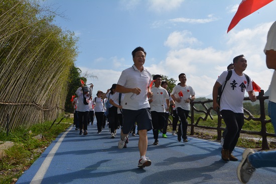 本次健步跑活动地点选择了桂林市郊大美漓江田园综合体休闲绿道中“桂林乌桕滩景区-竹江山-畔塘村-鸡冠山-莲花源华侨农场”绿道段,约5公里。绿道依山傍水,紧挨漓江而建,两侧开满了太阳花、兰花、三角梅......路面用彩色沥青混凝土铺装,整洁醒目。职工们置身其中,听鸟语蝉鸣,观漓水南去,从城市的喧嚣中抽离,追寻自然美景、享受山水乐趣。立秋已过,桂林的气温仍盘桓在三十多度,慢跑的职工们虽大汗淋漓,心情却格外畅快,蓬勃的生机与活力融合着大自然的美景,在蜿蜒的绿道上形成一道亮丽的风景。