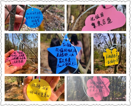 植树现场热火朝天,大家分工合作、配合默契,干劲十足,扶苗、对齐,培土、踩实,浇水……每一道工序都一丝不苟。在全员共同努力下,成功种植了36棵鸡爪槭树苗,为“栖霞丹枫”增添了新风景。植树后,大家在各自种植的树苗上留存了心愿卡,心愿卡上写满了对祖国、对党的美好祝愿,树林里五颜六色的卡片随风摆动,仿佛看到了祖国五彩斑斓的精彩未来。
