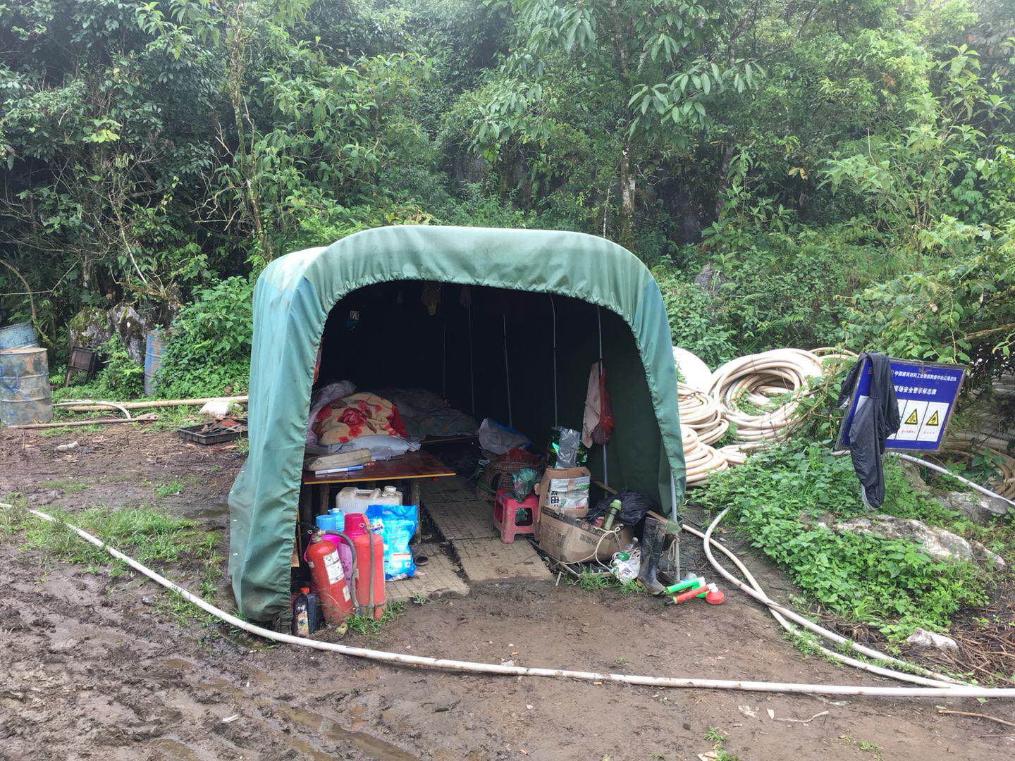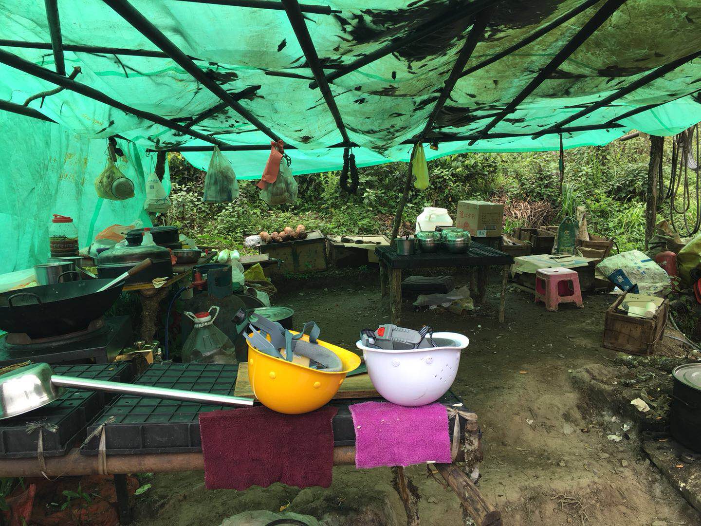 入秋的晚上,户外的空气湿润而寒风凛冽,地质人员结束了一天艰辛的工作后,开始回到住所。说是住所,其实只是一个随便搭建起来的简易帐篷,只能够勉强抵挡大风,根本无法御寒。所谓的厨房也是四周通风的窝棚,风一吹扬起的灰尘就会落在饭菜上,卫生情况极其糟糕。他们没有时间去采购食物,就一次性买了许多屯着,但因为雨水较多,也没有冰箱,新鲜的食材很快就坏了。入夜,靠一台简易小型发电机,帐篷里透出了昏暗微弱的灯光,辛苦了一天的地质队员们仍在电脑前埋头画图,他们用自己的工作态度点亮了绿春户外地质区的夜晚。