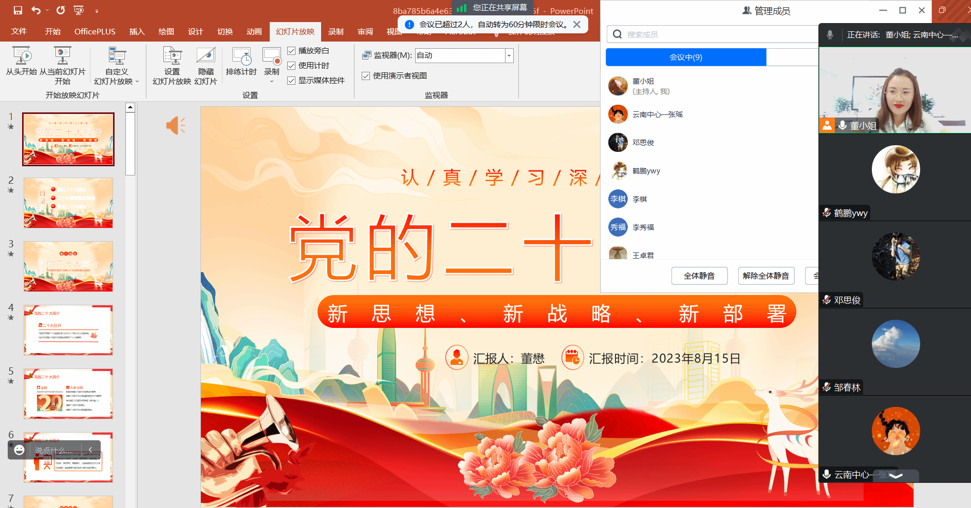 2013年8月15日,野外支部开展了“二十大报告新战略、新思想、新部署”为题的主题党日活动。活动采用腾讯视频会议的形式进行。党支部书记围绕党的二十大报告内容进行解读,尤其是对二十大报告里的15个方面主要内容及二十大金句进行深入交流分享,线上研讨亮点纷呈。