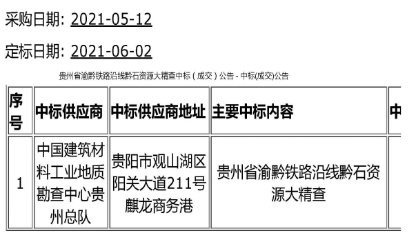 近日,中国建筑材料工业地质勘查中心贵州总队通过贵州省政府采购平台,通过竞争性磋商成功中标贵州省自然资源厅“贵州省渝黔铁路沿线黔石资源大精查”及“贵州省乌江流域黔石资源大精查”两个项目,中标合同总金额超1000余万元。