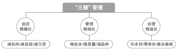 “三精”管理的核心内容是组织精健化、管理精细化、经营精益化。组织精健化就是减机构、减层级、减冗员,各企业要保持压减节奏,避免企业膨胀、管理不到位出现“跑冒滴漏”。管理精细化就是降成本、提质量、增品种,各企业要深入实施八大工法、六星企业、增节降等管理工法,全面落实成本费用节约计划,加强质量管理,增加产品种类。经营精益化就是价本利、零库存、集采集销,各企业要继续坚持“价本利”经营理念,聚焦市场,稳定价格,以销定产,实时生产,集中采购销售,争创更大效益。