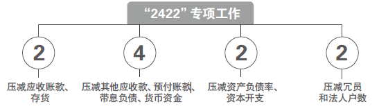 “2422”专项工作中,“2”指压减应收账款、存货,“4”指压减其他应收款、预付账款、带息负债、货币资金,“2”指压减资产负债率、资本开支,“2”指压减冗员、法人户数。深入实施“2422”专项工作,可全面提升企业运行质量,真正实现瘦身健体、提质增效。