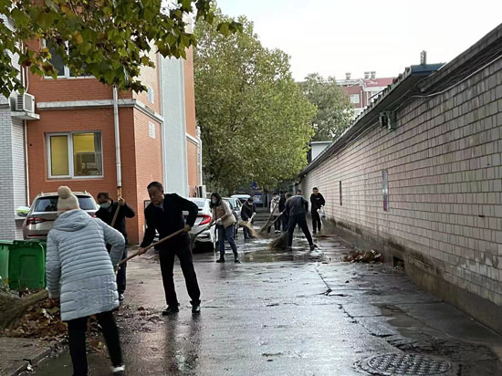 11月8日组织志愿者走进总队原家属院小区,帮助清理路面积水、树叶。