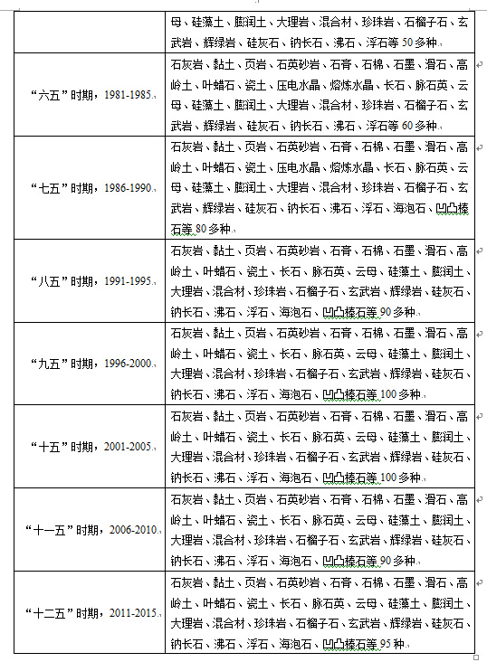 二十世纪80年代,是我国建材地质事业大发展时期,也是我国非金属矿找矿取得重大突破的时期,使我国非金属矿进入大开发时期。硅灰石、累托石、海泡石和纤维状海泡石、凹凸棒石、绢英岩、水云母、水泥配料用千枚岩、夕线石、蓝晶石、红柱石、杂卤石、霞石正长岩、透闪石、透辉石、粉石英、钠长阳起石片岩、麦饭石等矿种都是在这个时期取得重大突破的。