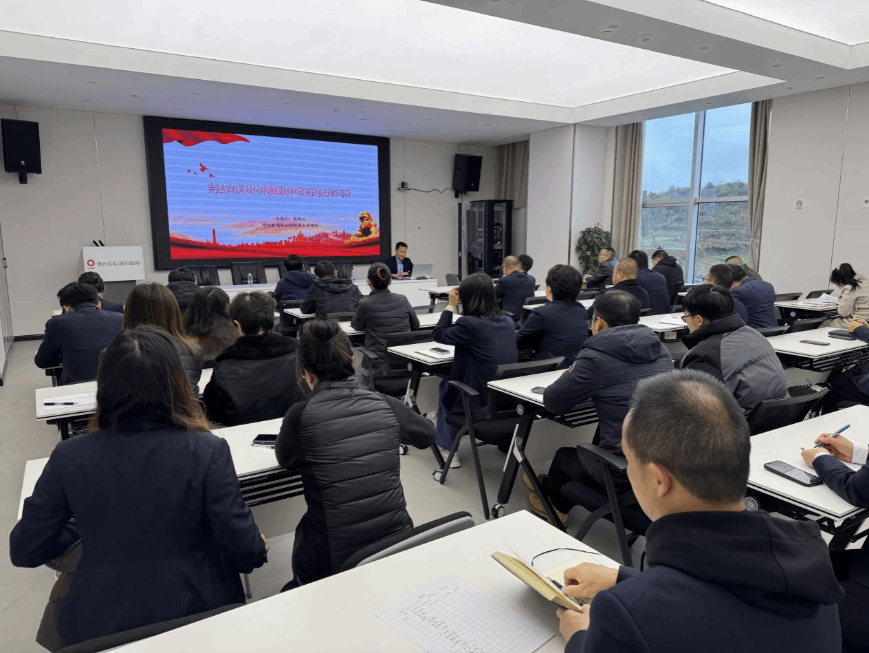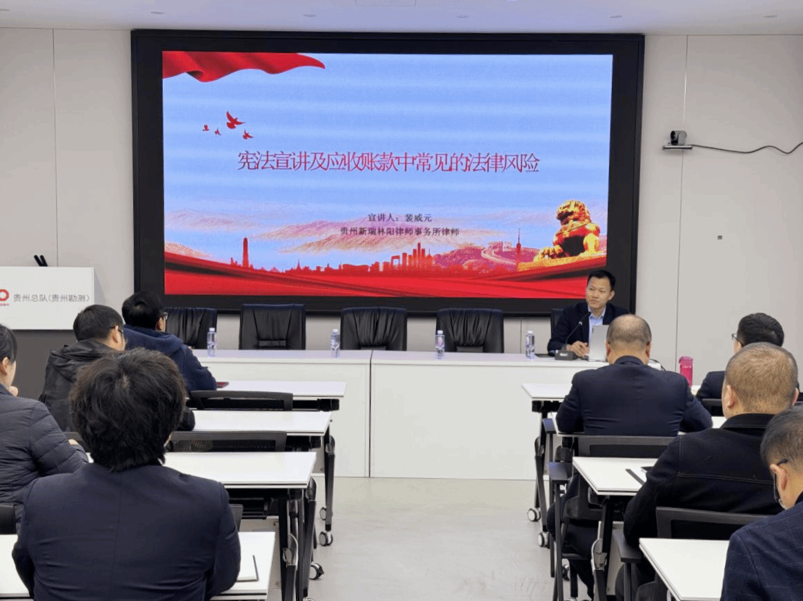 此次法治讲堂邀请贵州新瑞林阳律师事务所裴威元律师作题为《宪法宣讲及应收账款中常见的法律风险》的专题讲座。裴律师详细讲解了宪法宣传周的由来和意义;2024年宪法宣传周的重点宣传内容;应收账款中常见的法律风险等内容。同时,对贵州总队(贵州勘测)开展应收账款催收工作中的疑难问题进行了答疑解惑,给出了专业建议及应对策略。