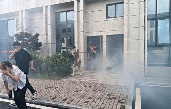 火灾事故模拟情景:全体人员在研发中心办公大楼内正常办公,10 时许,办公大楼三楼打印室因人员吸烟引发火灾,消防报警系统检测到烟雾后启动自动报警,消控室值班人员发现火灾警情后,立即使用消防广播通知楼栋内所有人员紧急疏散,并拨打119火警电话进行模拟报警,同时向总队安环部负责人报告,启动应急预案,应急疏散组指引全体员工有序疏散至安全区域。