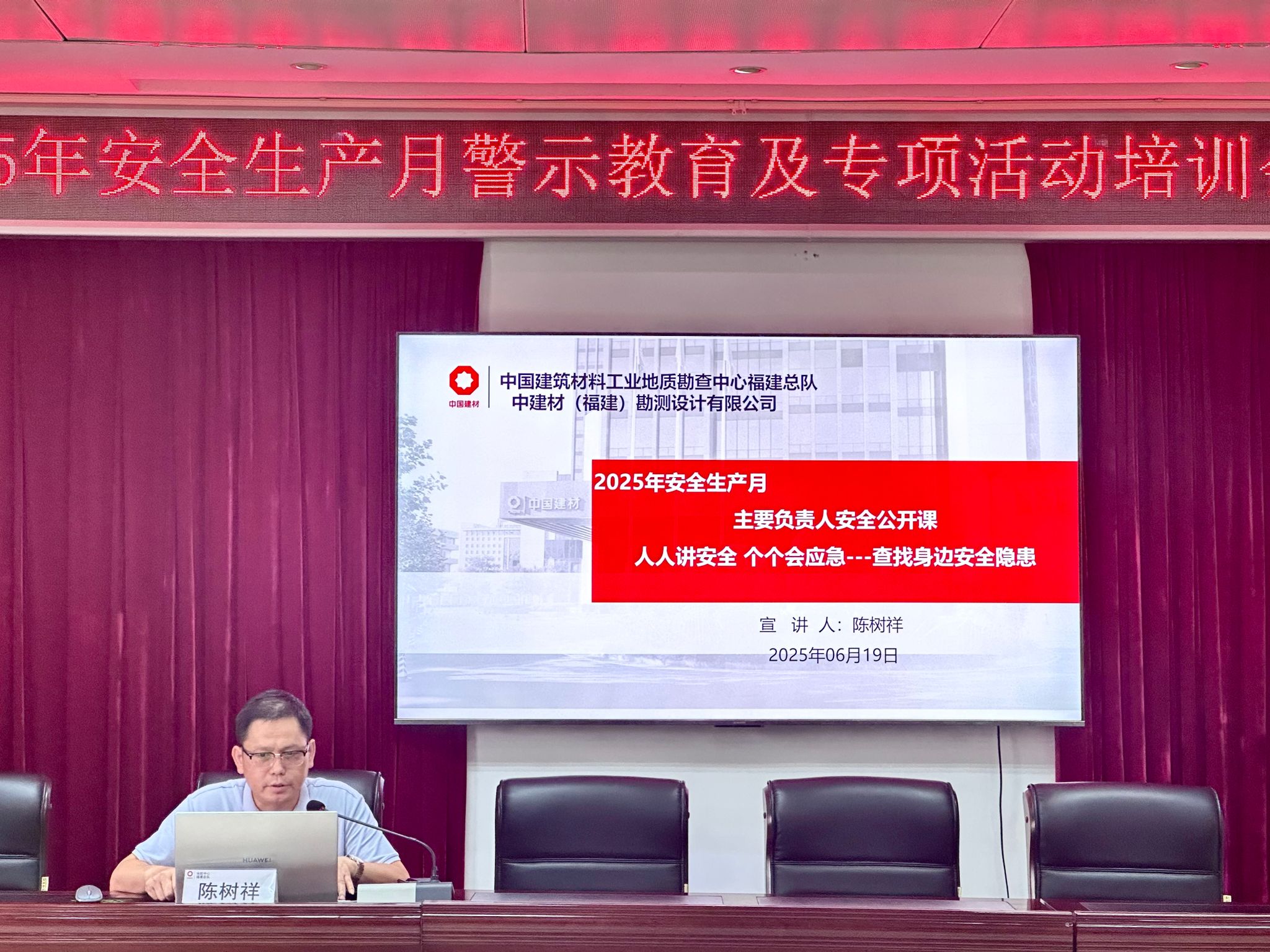 为深入贯彻落实国家安全生产会议精神和工作要求,切实筑牢安全生产防线,强化全员安全意识,根据集团、中心“安全生产月”有关工作部署,6月19日,中国建材地勘查中心福建总队组织召开“安全生产月”警示教育及安全培训会议,总队全体干部职工齐聚七楼大会议室,共同参与这场安全生产“必修课”。