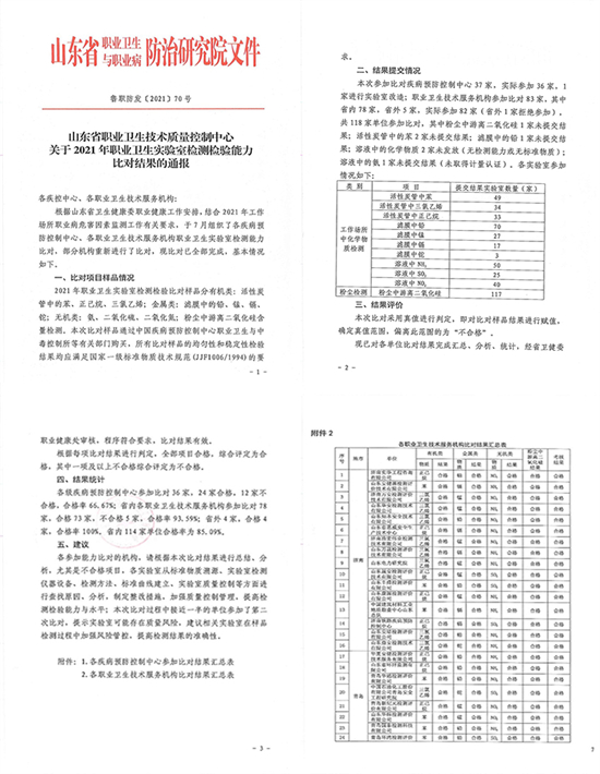 发布日期:2022-02-28 作者:山东总队山东省职业卫生与职业病防治研究院于2021年7月12日发布《关于开展2021 年山东省职业卫生检测实验室比对工作的通知》(鲁职防发〔2021〕59号文),安全技术研究院高度重视本次考核,组织张耀华、王盼盼、靳亚阑等业务骨干完成盲样考核实验,经山东总队专业总工孟燕与副院长孙秀锦审核后报出结果。此次游离二氧化硅、苯、氨及镉等四项盲样考核结果均为合格,一次性通过了全省职业卫生实验室间的盲样比对考核。