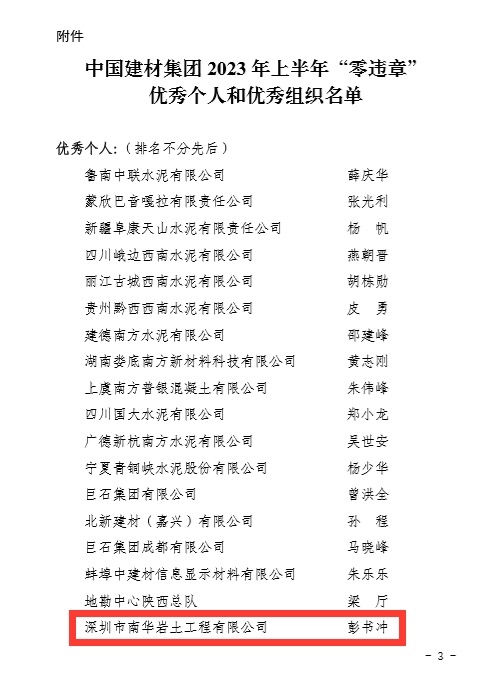 近日,集团对2023年上半年“零违章”优秀个人和优秀组织进行表彰。地勘院所属南华公司彭书冲同志荣获集团上半年“零违章”优秀个人称号。