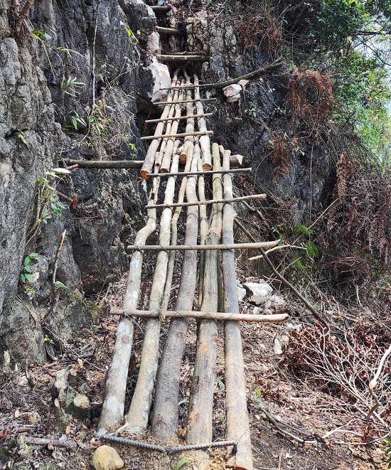来到大雅矿区,我们看到了一个“新型装备”——索吊。由于山太陡,即使修了一条小路,机器也没有办法运上山,只能把机器大卸八块拆成一个个零部件用索吊运上山。机器的困难算是解决了,人呢,怎么上山呢?有条件上,没有条件创造条件也要上!地质人凭着“逢山开路,遇水架桥”的韧性,遇到陡的路,用锄头挖出一个个坑,踩着坑上山就没那么滑了。遇到路断开的,用树木捆绑在一起便架起了一座简易的木桥。