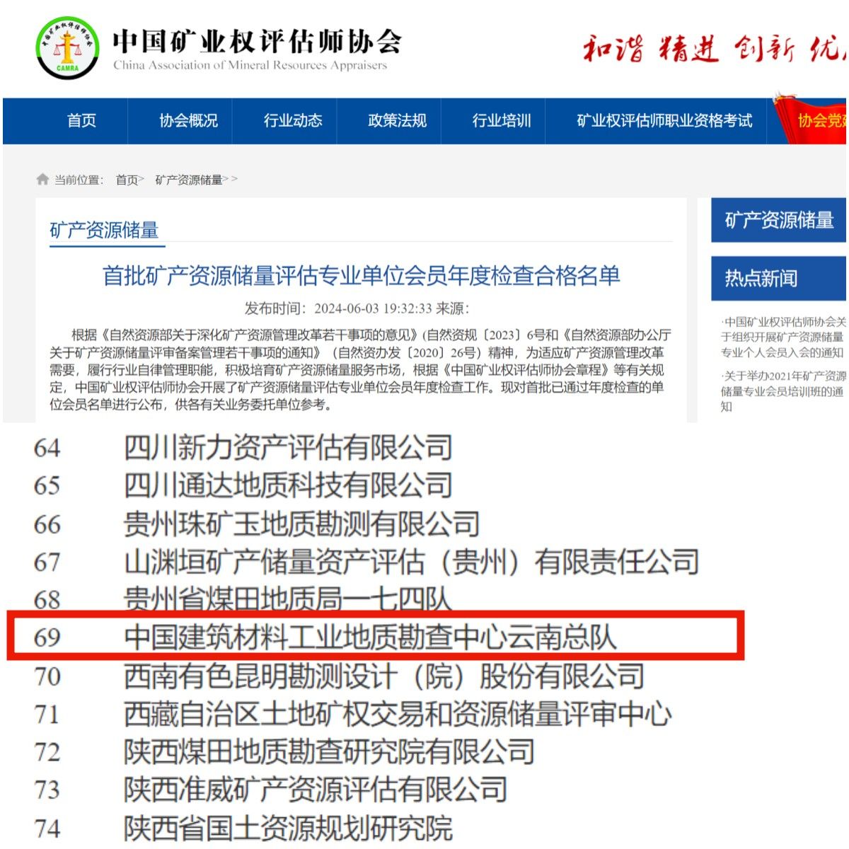 作为首批通过年检的会员单位,云南总队在矿产资源储量评估方面工作的实力得到专业领域的充分肯定,也为今后总队实施矿产资源储量市场评估业务提供了坚实保障。